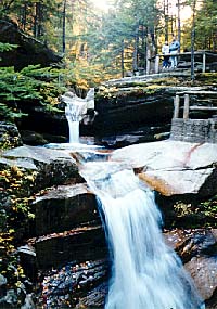 We left the White Mountain campground early (7:30am) hoping to possibly see moose during the rest of our drive through the forest. Not long after we left, we stopped on the side of the road where the window over our RV's table afforded a great view of a swampy lake--the kind of terrain moose enjoy feeding at. As we had a pancake breakfast with the pure maple syrup we'd bought the other day, we enjoyed the view, but there were no moose. Before we left the forest, we took a hike to Sabbaday Falls. (This page contains the only photo with me in it--up above the falls in the second photo!) The sign reads: Sabbaday Falls. Walking time, 30 minutes round trip. The name, Sabbaday, was given by early explorers during their travels to the Passaconaway Valley. Having reached the falls on a Sunday, they decided to return home. In the years to follow, the falls became a favorite "Sabbath Day" journey... By midday, we got to Gorham, New Hampshire, where the AAA book said we could schedule a moose-watching tour. We found the site in Gorham, but that evening's tour had already been booked full. We were already a day behind our original schedule, so we decided we couldn't afford the time to stop in Gorham, mess around all afternoon, camp, and wait all day Wednesday for the next tour. We drove to Mexico, Maine, where we stopped for lunch. A man told my dad that he had just seen 6 moose down this highway not far from where we were, so we took off looking for them. When we'd driven farther than we figured the man was talking about without seeing any moose, dad decided to take another road for "a little while" just to see if we'd find moose. We spent two hours and 50 miles on what I called a wild moose chase. My mom and I were pretty upset at the time, but naturally we look back on the incident and laugh hysterically. The road turned to dirt and became what I am convinced was a logging and hunting road--in a 20ft. RV motor home!! Sorry that there are no photos of this excursion. Thanks to the hightened hostility, getting back on paved road, at the time, seemed more important than snapping pictures. We might have been able to convince my dad to turn around after about 15 minutes if it were physically possible. The road (if you could call it that) was so narrow, and the shoulders so soft, we were afraid to attempt a turnaround. We finally found a place where we dared to turn around, drove back to Mexico, and on to Bangor, Maine. Well, we never did see any moose. Live anyway. Sadly, due to hunting season, we did see two pickup trucks on the road, each with a moose hunters had shot. :-(