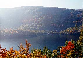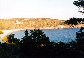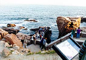 Half-way through our journey. We had reservations to go whale-watching today, but it was so foggy, we rescheduled for the next day. So instead, after lunch, we spent the afternoon driving through the Acadia National Park. Before we left Bar Harbor, though, we noticed that the Queen Elizabeth II cruise ship was docked just off the shore and people were tendering in to the town. The fog hanging over the ship made for a neat photo. The drive through the park was just as colorful as through the Kancamagus Highway in New Hampshire, and the view from Cadillac Mountain was superb. We could see Bar Harbor and the Q.E. II down below. Also, in the park, we saw Sand Beach. Normally, Maine's shores are rocky, but due to the inset beach here, a rare sandy beach lies. Then we got to Thunder Hole. The rock formations there were neat to look at. However we were kind of there at the wrong time of day (the tide was high) and we didn't really hear the thunderous boom caused by the waves crashing around the rocks, and air being sucked in and out from underneath. We also saw Egg Rock Light way off in the distance, but would see it closer up on the whale-watching boat tomorrow. Just before dark, we drove the rest of the way around the island to Bass Harbor Light. The sign at the head of the road said no RV's because of limited turnaround space, so we walked the mile or so down. (We discovered we could easily have turned our RV around, but in the moderately cool air, it was a nice walk, anyway.) The sign leading to the light reads: Bass Harbor Head Light. Among the best known and most photographed spots in Maine, the Bass Harbor Head Light was built in 1858 to mark the bar across the eastern entrance to Blue Hill Bay. The grounds and residence of this facility now comprise the private residence of the commander, United States Coast Guard Group Southwest Harbor, and are not open to the public. Trails on both sides of the parking lot allow visitors access to excellent views of the lighthouse and the surrounding coastline.