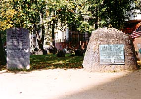 The tombstone on the left marks the grave of the five victims of the Boston Massacre, Samuel Gray, Samuel Maverick, James Caldwell, Crispus Attucks, and Patrick Carr. On the right is Samuel Adams' grave, a signer of the Declaration of Independence and Governor of the Boston Commonwealth. |